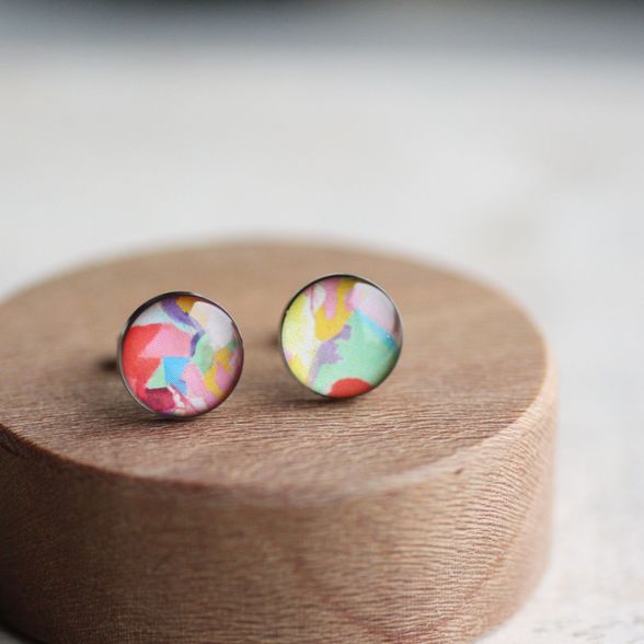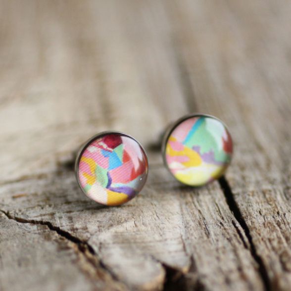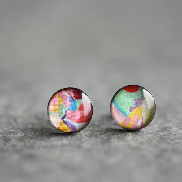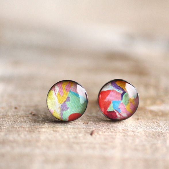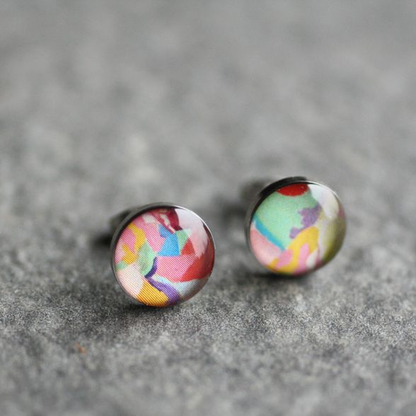Sebészeti acél pötty fülbevalók, Robert Delaunay: Nő esernyővel c. fantasztikus színvilágú festményével díszítve.