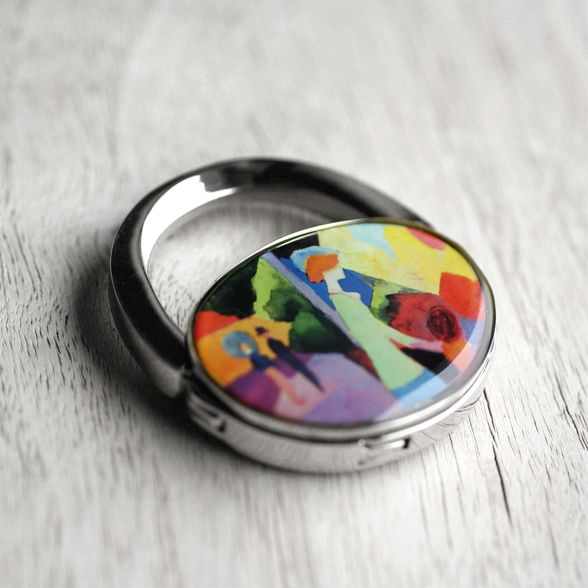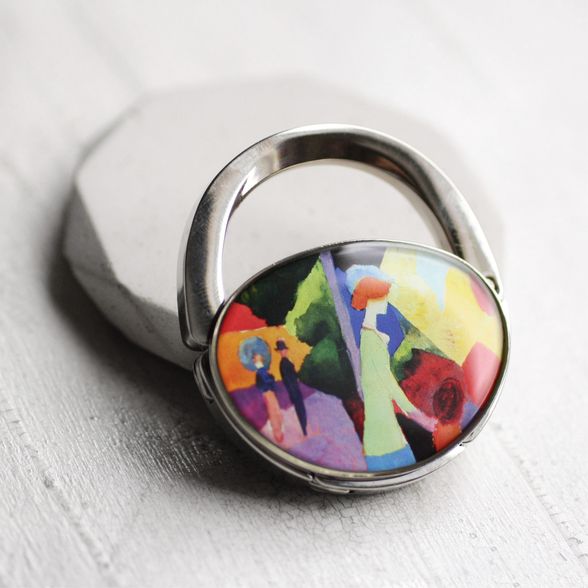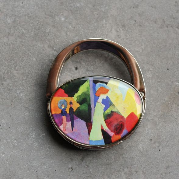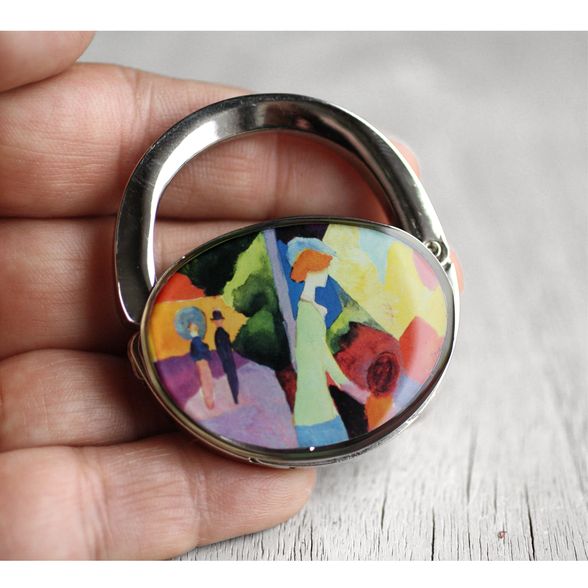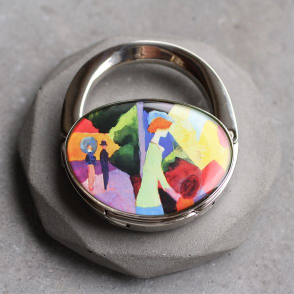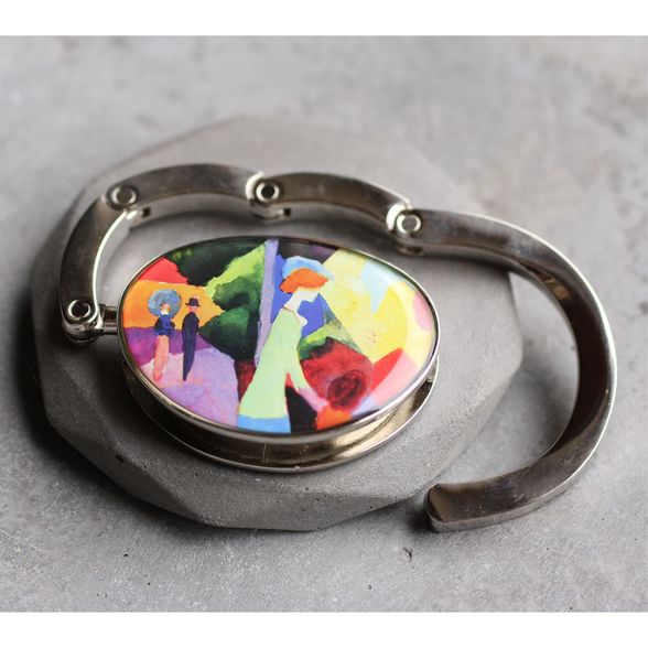 Táska formájú asztali táskaakasztó (táskadísz / táskafogas / táskatartó kampó) , August Macke: A divatüzlet kirakatánál c. színpompás festményével díszítve.