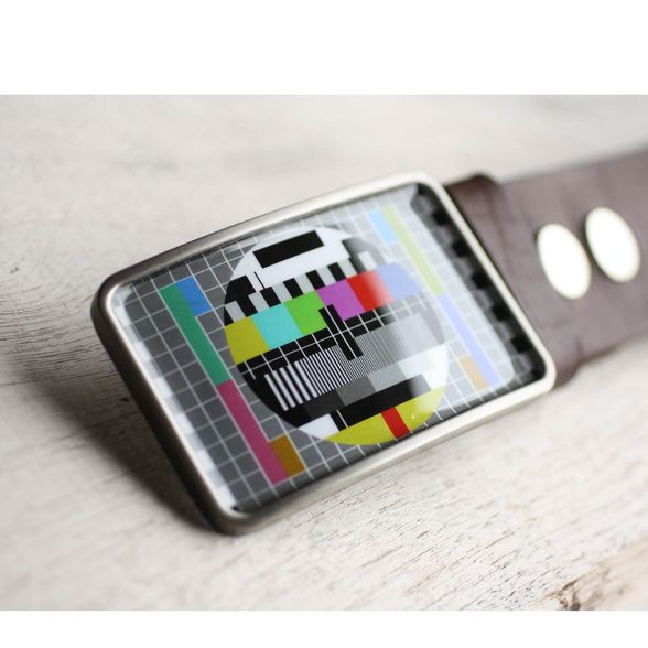 Monoszkóp / adásszünet / TV szünetjel grafika szögletes övcsaton. Vidám, színes darab.