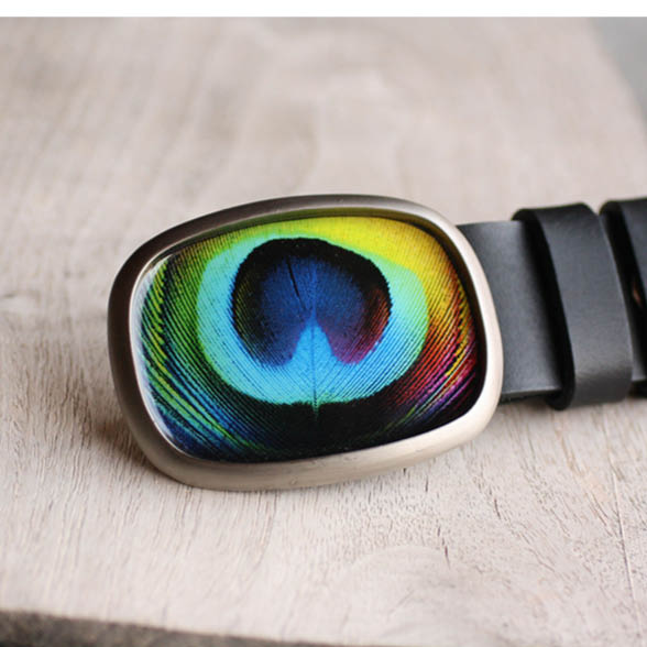Gyönyörű élénk színű kék pávatoll motívum ovális övcsaton.