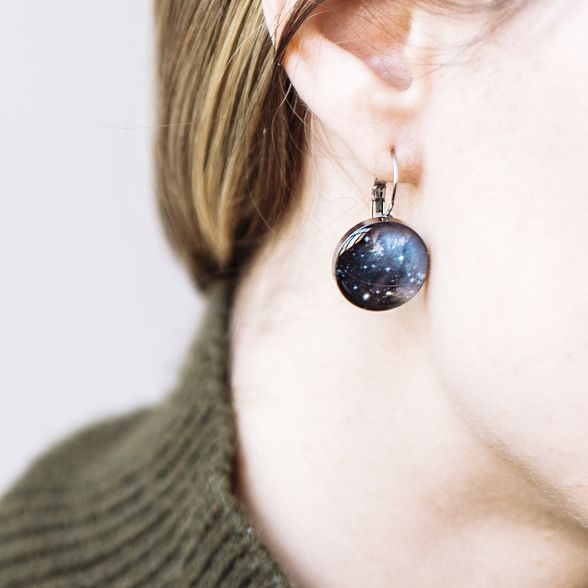 Gyönyörű sötétkék világűr (csillagköd / nebula) antiallergén sebészeti acél francia kapcsos fülbevalóba foglalva.