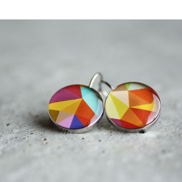 Színes, vidám geomterikus minta antiallergén sebészeti acél függő fülbevalón.
